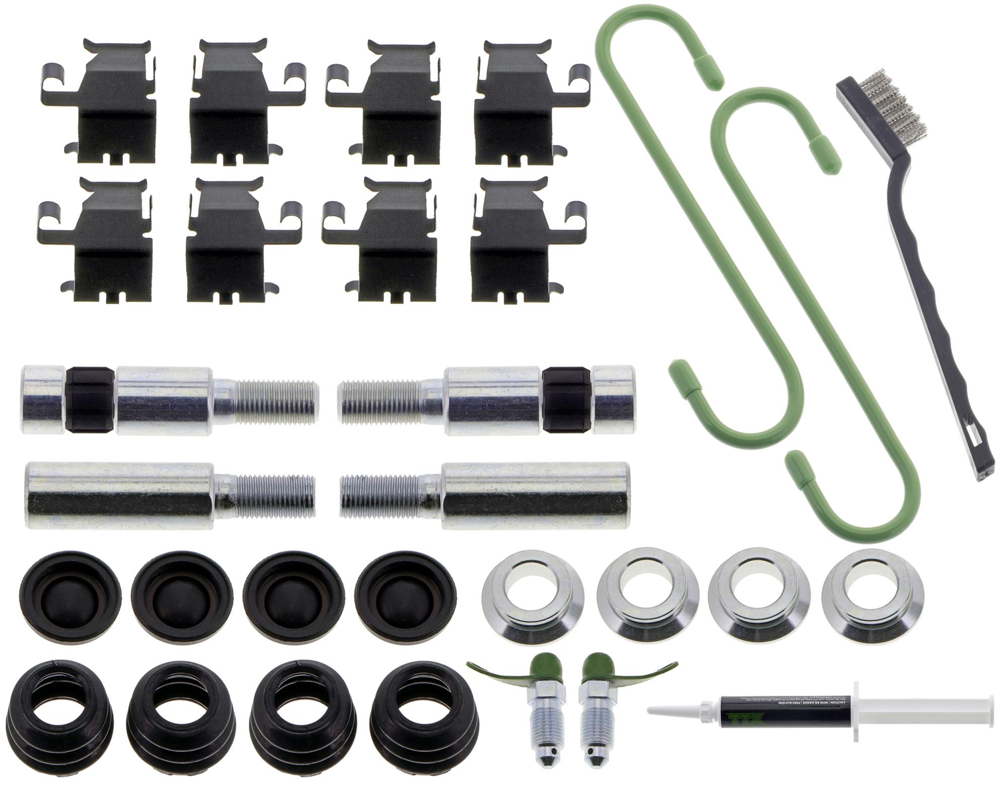 - COMPLETE BRAKE PAD INSTALL KIT: Includes abutment clips, caliper hangers, bleeder screws, boots, bracket bolts, slide pins, anti-rattle springs, brake pad wear sensors, indicator, wire brush, and lubricant (varies by application).